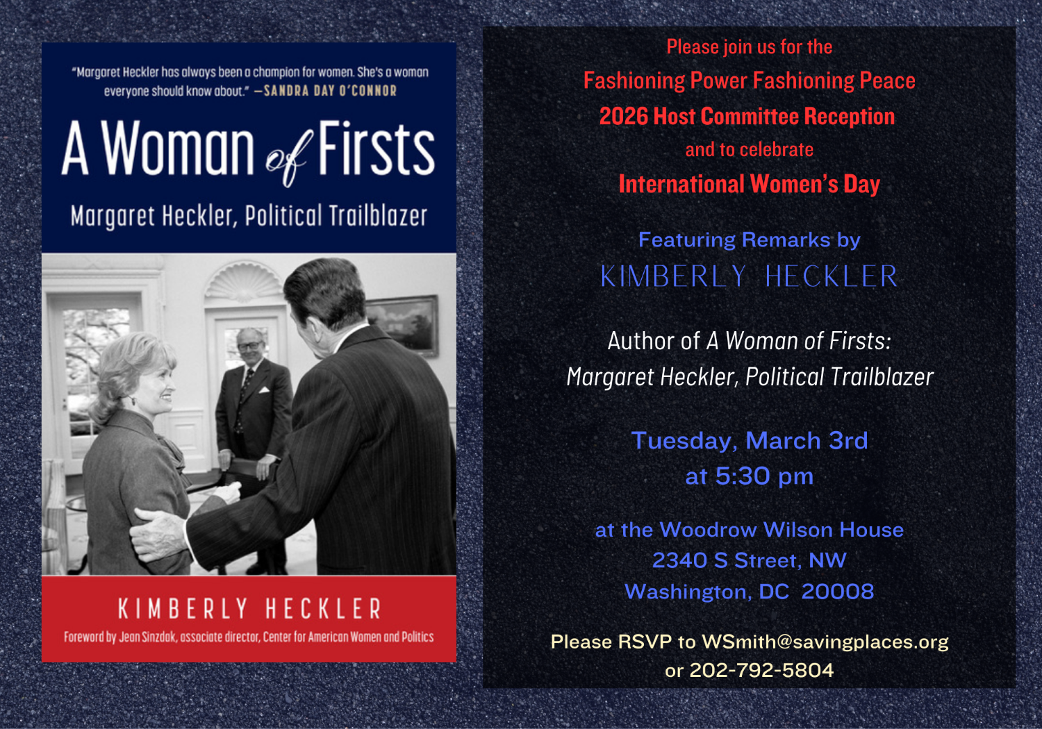 In honor of Women’s History Month, The Woodrow Wilson House is delighted to welcome bestselling author Kimberly Heckler for a special discussion on her book, A Woman of Firsts: Margaret Heckler, Political Trailblazer. Recently selected as one of the top five picks on the Harvard Kennedy School's Women and Public Policy Program’s 2025 Summer Reading List. This biography has been hailed as both inspiring and timely.